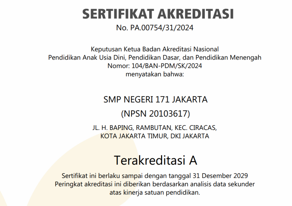 Akreditasi SMP Negeri 171 Jakarta bisa anda unduh dibawah ini atau di menu download pada website ini